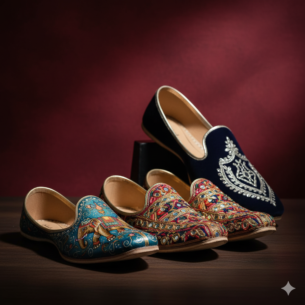 Hand-painted juttis are a rising trend, offering a level of bespoke personalization that is hard to match. Master artisans carefully paint custom designs directly onto the leather surface. This is a highly personalized segment of the Groom’s Traditional Footwear Collection.