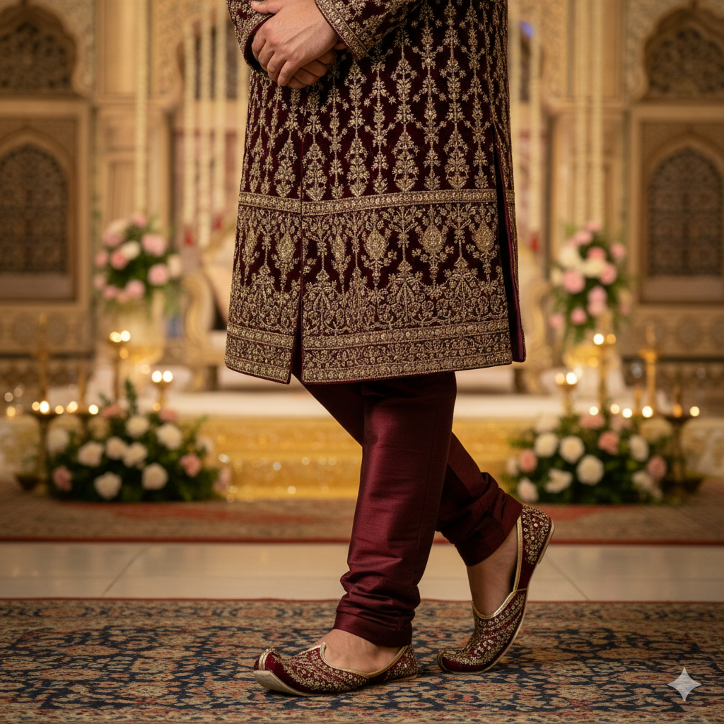 - Deep Velvet Tones (The Winter/Reception Look): For winter weddings, reception parties, or cocktail nights, velvet Juttis in deep maroon, royal blue, emerald green, or classic black offer a bold, aristocratic statement. Often adorned with subtle beadwork or thread embroidery, these pieces from the Royal Jutti Collection for Men exude unmatched gravitas and are a favorite among stylish grooms.